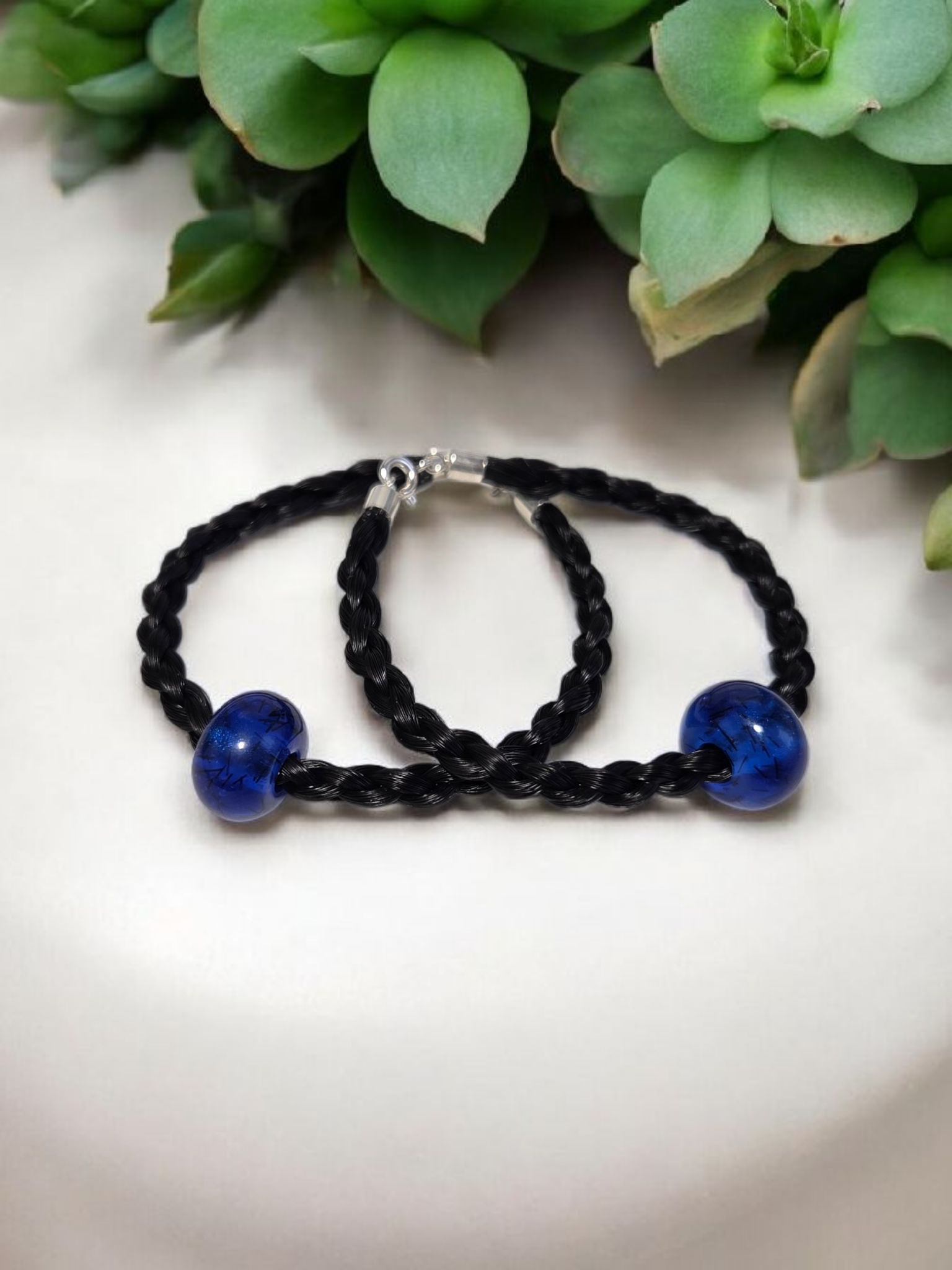Four stand braided horse hair bracelet (price is for one bracelet). Created using your horses tail hair (please note we can not use mane hair as this is not as strong as tail hair) we ask for you to send aproximately 5mm thick hair (as thick as a pencil) that will wrap around your wrist twice loosely for each bracelet you require.